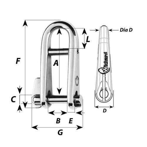 Wichard - Sleutelsluiting met brug HR. Doordat de sluiting gesmeed is uit 'HR' RVS heeft deze sluiting een hogere breeksterkte en werkbelasting dan de 'standaard' Wichard Sleutelsluiting met brug. De brug zorgt er voor dat de sluiting gezekerd is aan de splits (of knoop). De sluiting is leverbaar in 5, 6 en 8 mm (Dia D). Bekijk de tweede afbeelding en de tabel hieronder voor de belangrijkste specificaties.