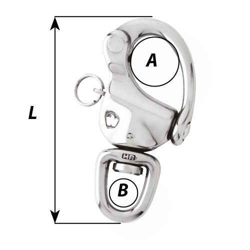 Topkwaliteit Wichard gesmede snapsluiting met wartelend oog. De HR kwaliteit (RVS type 17.4 PH) zorgt voor een uitstekende werk- en breekbelasting. Leverbaar in drie maten. De 70 mm uitvoering is geschikt tot lijnen met een diameter van 10 mm, de 90 mm uitvoering is geschikt tot lijndiameters van 14 mm en de 120 mm uitvoering is geschikt tot lijndiameters van 20 mm.